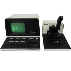 - Control Console: The control console’s keyboard includes keys to control the scan head, measure the acquired data and print out the results. The Dektak IIA video monitor is a 9” monochrome CRT which displays programs and graphics.